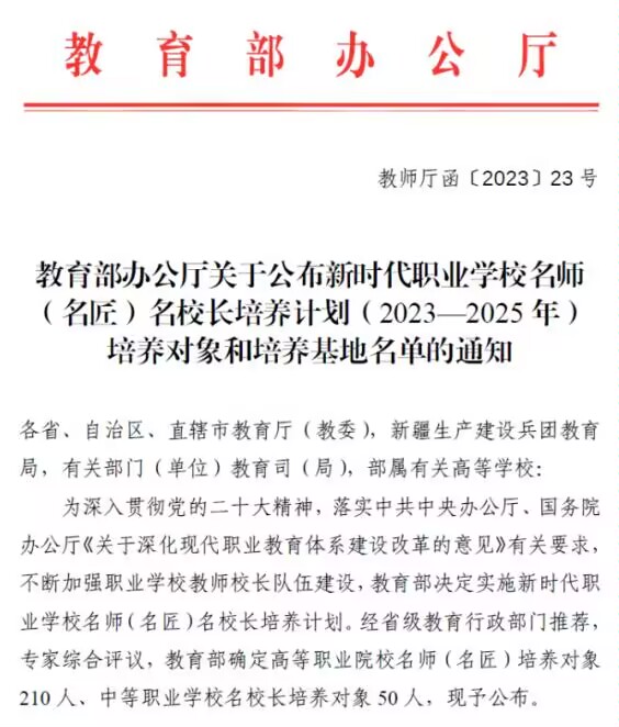 近日,国家教育部办公厅公布了新时代职业学校名师(名匠)名校长培养计划(2023—2025 年)培养对象和培养基地名单,威尼斯官网颜志明教授成功入选新时代职业学校名师培养对象。