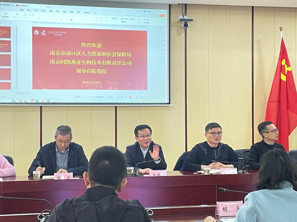 3月22日上午,南京市浦口区人力资源和社会保障局局长胡景、副局长陈志勇、吴蕾,南京同凯兆业生物技术有限责任公司常务副总经理蔡家栋等一行9人莅临威尼斯官网,就政校行企合作平台搭建、毕业生就业推荐、科研对接等进行了交流。学院党委委员、副院长毕德全,学生工作处、茶与食品科技学院、畜牧兽医学院等部门相关负责同志及相关专业教师参加了交流会。