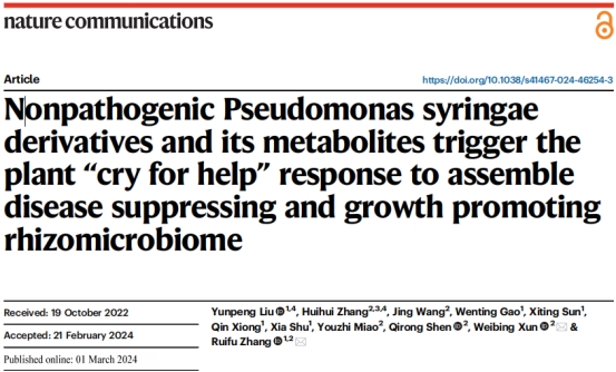 近日,《自然·通讯》(Nature Communications)(IF=16.6)在线发表了农学园艺学院张慧慧博士完成的最新研究成果(Nonpathogenic Pseudomonas syringae derivatives and its metabolites trigger the plant “cry for help” response to assemble disease suppressing and growth promoting rhizomicrobiome)。