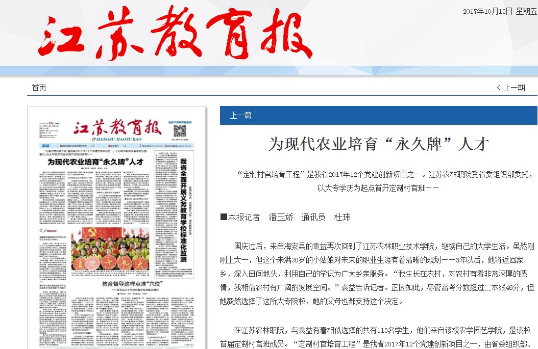 《江苏教育报》10月13日头版头条以《为现代农业培育“永久牌”人才》为标题,大篇幅报道威尼斯官网通过“定制村干培育工程”,为现代农业培育既能在一线从事现代农业生产,又具备村务管理能力和基层治理能力的新农村基层党政干部后备人才。